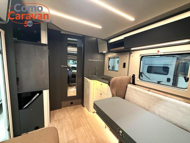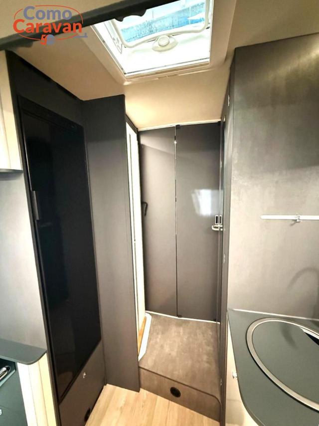 Fodere cabina coordinate con il soggiorno, serbatoio di recupero coibentato e riscaldato, cupolino con skyview integrato apribile, letto basculante elettrico sopra il soggiorno, cappa aspirante in cucina, predisposizione retrocamera, serbatoio di recupero riscaldato, oscuranti interni plissettati in cabina per parabrezza e cristalli laterali, predisposizione pannello solare, pedana in legno per la doccia, moquette cabina guida, porta cellula premium XL con chiusura centralizzata con telecomando, finestra oscurante, vani di stivaggio e pistoni a gas, pareti camera de letto posteriore rivestite, cestelli e portabottiglie estraibili in cucina, Tappezzeria Siena, Cuscini Umbria - DI SERIE -