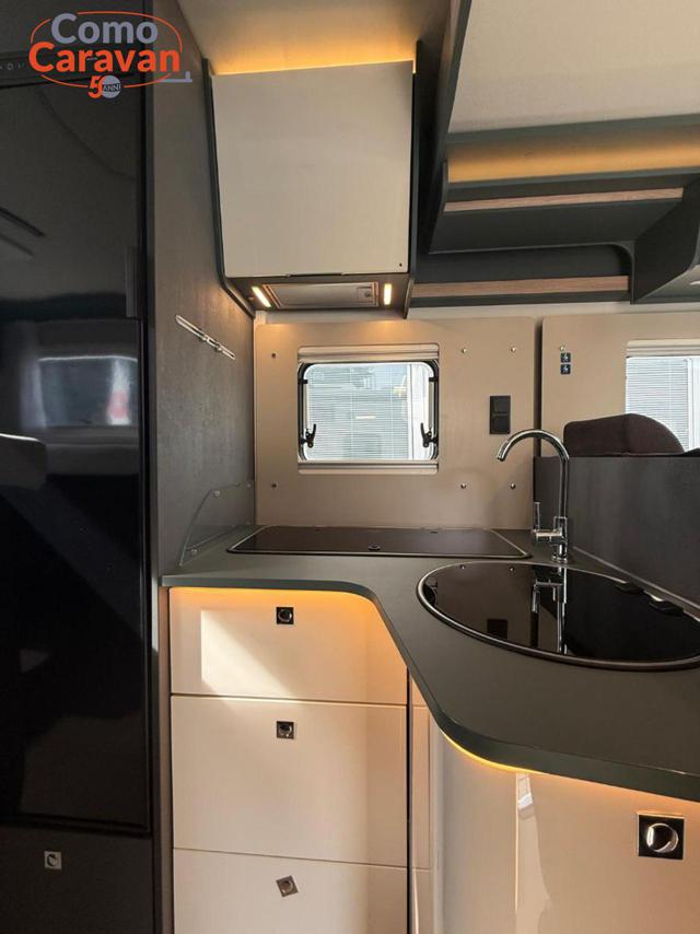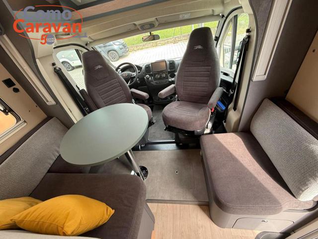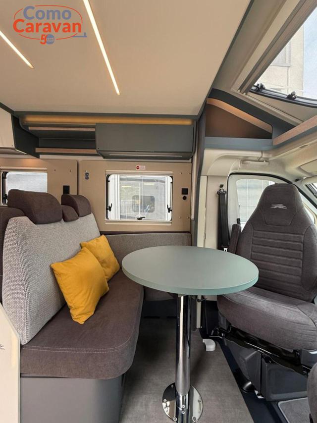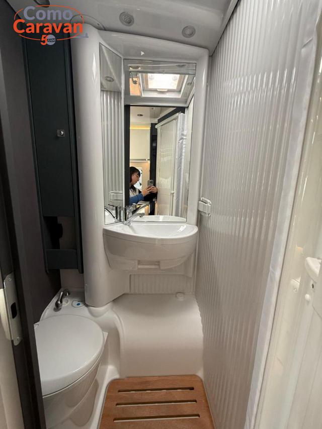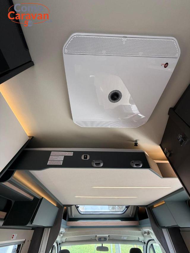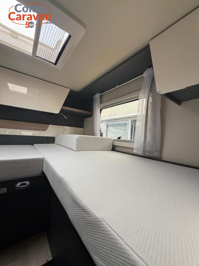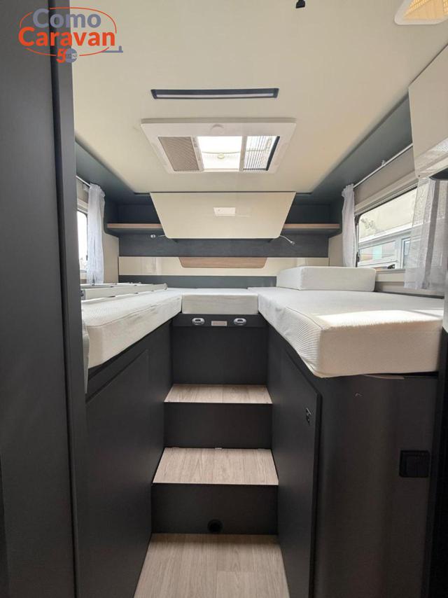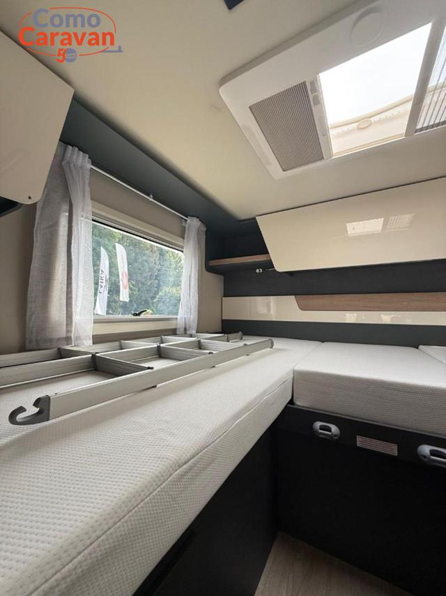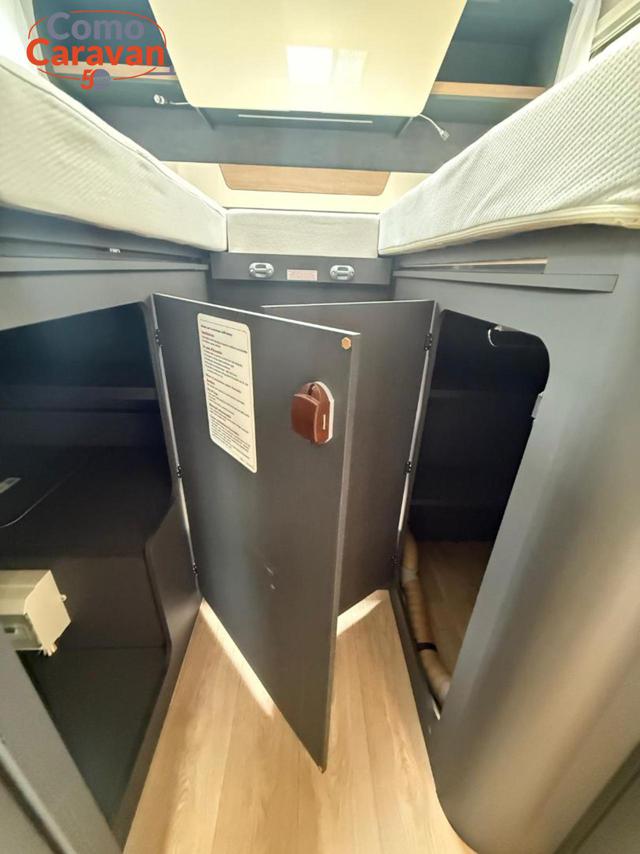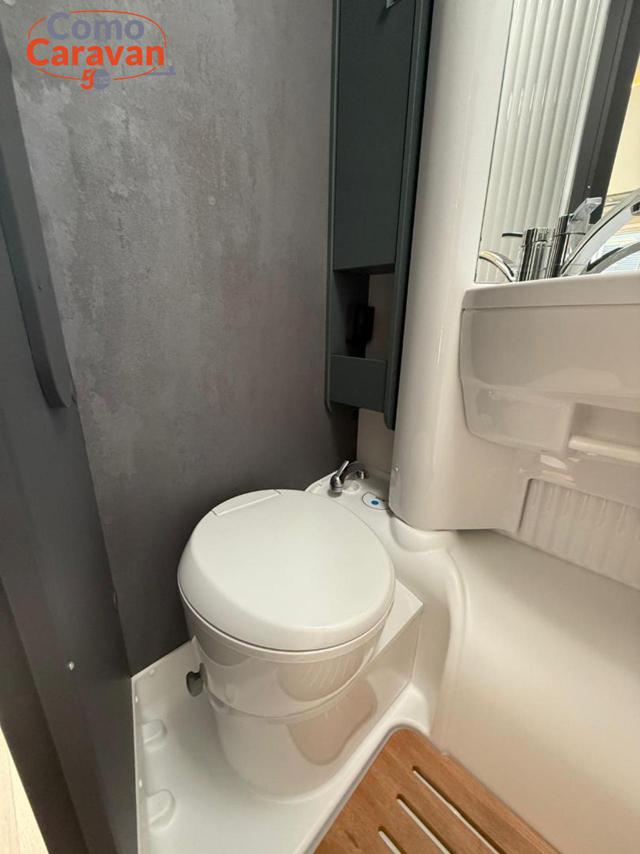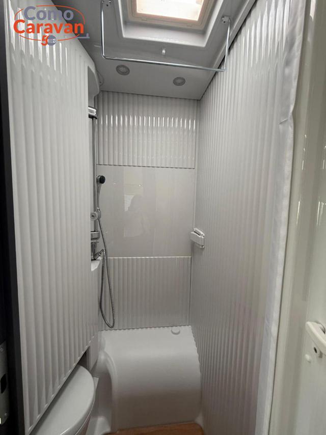 Pacchetto comfort: Pedana in legno per la doccia, moquette cabina guida, cappa aspirante in cucina, serbatoio di recupero coibentato e riscaldato, cupolino con skyview integrato apribile, cestelli e porta bottiglie estraibili in cucina, porta cellula Premium XL con chiusura centralizzata con telecomando, finestra, oscurante, vani di stivaggio e pistone a gas, predisposizione telecamera retromarcia, fodere cabina coordinate con il soggiorno